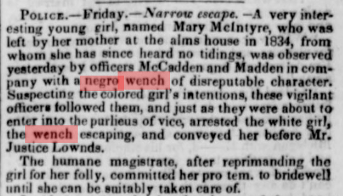 Something that emerges during this time period is the use of the term “negro wench” in conjunction with illegal, illicit, wrongful, or unsavory conduct. For example, this article in the New York Herald describes the allegedly corrupting influence of a “negro wench” on a young white orphan. The New York Herald, at 2 (May 06, 1837), Chronicling America: Historic American Newspapers, Lib. of Congress (available at https://chroniclingamerica.loc.gov/lccn/sn83030311/1837-05-06/ed-1/seq-2/).
