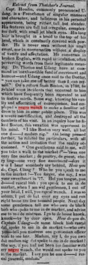 1823. Beyond advertisements for runaway slaves and sales, American newspapers and accounts confirm the derogatory and demeaning nature conveyed by the phrase “negro wench.” In one account, published in the Portland Gazette, allegedly from Thatcher’s Journals, the storyteller speaks of his mortification and shame as to being approached by a “negro wench” in public, apparently the victim of some horrific practical joke. The writer uses the phrases “d*****d madam nig,” “d*****d rascal bish,” “black bish rascal,” “black bish,” and “rascal wench,” all to tell a story commanding “an inexhaustible fund of merriment and humour.” “Extract from Thather’s Journal,” The Portland Gazette, (Portland, ME Nov. 11, 1823), Chronicling America: Historic American Newspapers, Lib. of Congress (available at https://chroniclingamerica.loc.gov/lccn/sn83016083/1823-11-11/ed-1/seq-4/).